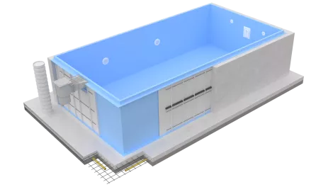 An overflow gutter is a component fitted to the edge of the pool that allows water to drain through the gutter. Water escaping from the pool flows into the gutter, is stored in a special tank, filtered and reinjected into the basin.